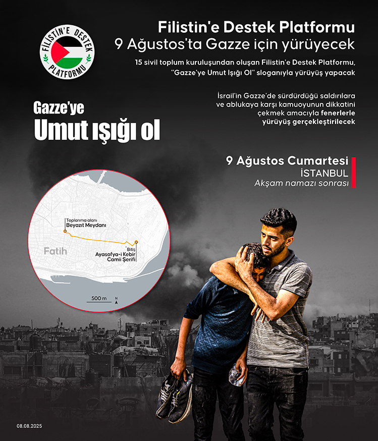 Filistin’e Destek Platformu, İsrail’in Gazze’deki saldırı ve ablukasına karşı farkındalık oluşturmak amacıyla İstanbul’da “Gazze’ye Umut Işığı Ol” sloganıyla yürüyüş düzenleyecek. Platformun dönem başkanı Mehmet Güney, tüm vatandaşları etkinliğe katılmaya çağırdı.